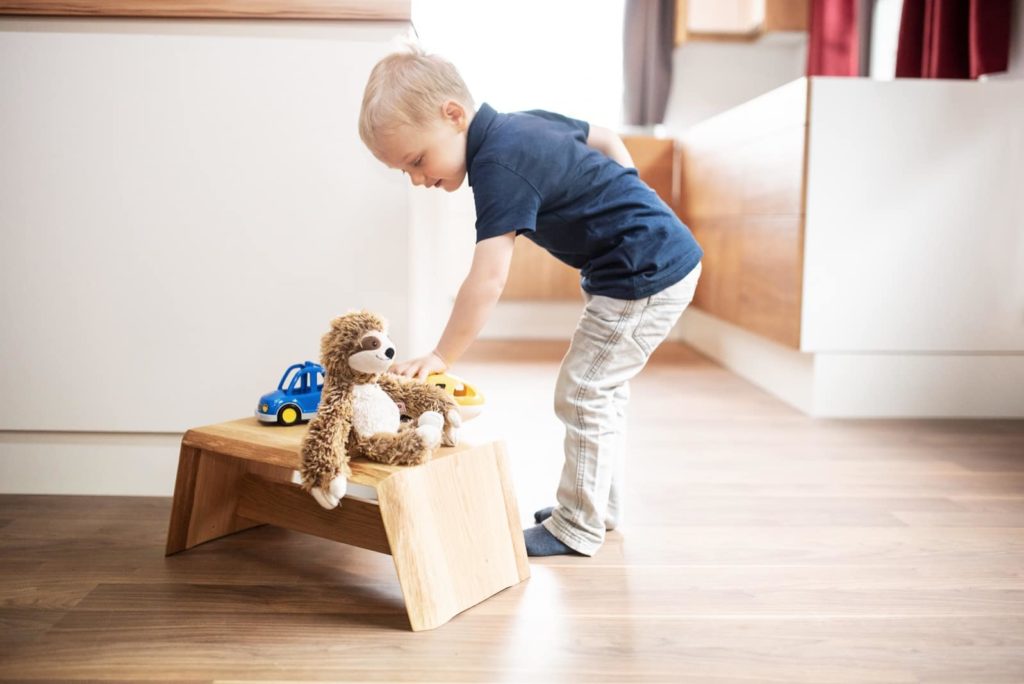 So fing der kleine Sohn an zu rütteln. Zuerst ganz leicht, dann immer stärker, denn er merkte, was für eine Kraft sein Tatendrang bereits entwickeln konnte. Der Hocker des Kleinen hatte praktisch keine Chance und gab nach. Er fiel regelmäßig damit um.