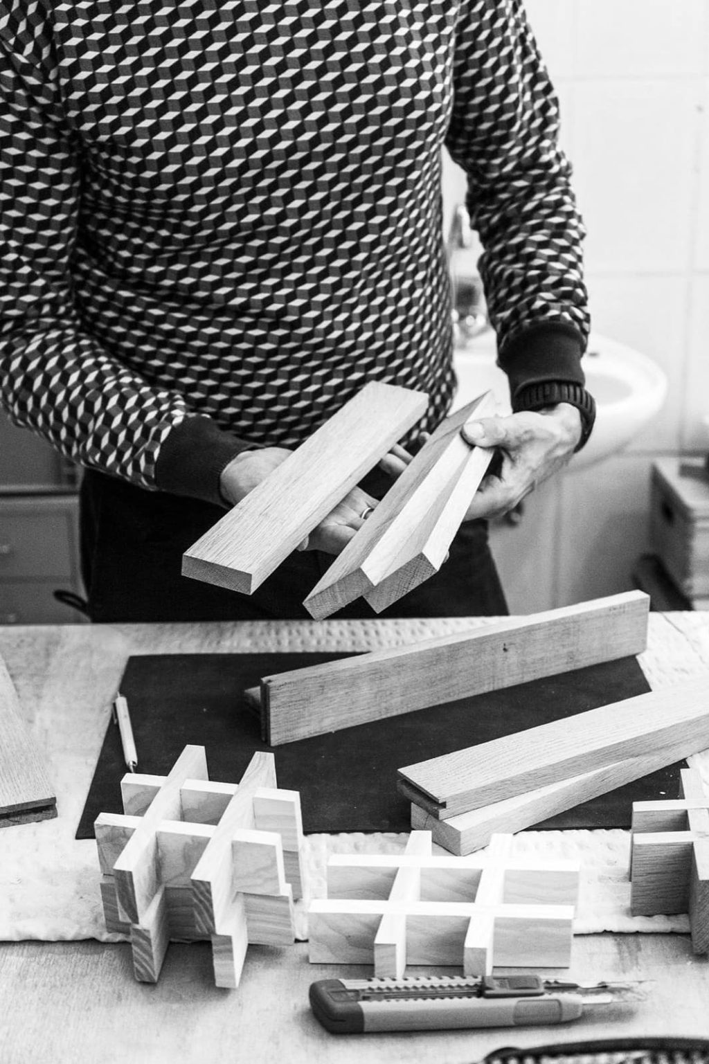 Holz ist das Grundmaterial von Mutamo. Das ist auch das Material, mit dem der Grazer Markus Well arbeitet, insbesondere im Kontext von Upcycling. Zentrales Thema ist für ihn die Aufwertung von vermeintlichen Abfallprodukten. Bei Entsorgungsarbeiten entdeckte Well auf einer Mülldeponie eine Menge an hochwertigem, einwandfreien Massivholzparkett aus Eiche. Die Entdeckung brachte eine Inspiration mit sich: Was, wenn man doe kleinteiligen Holzstücke neu zusammensetzen könnte?