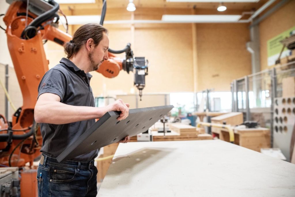 Die Grundlage von Orto, die verkeilten Holzstäbe, benötigen exakte Bohrungen in bestimmten Winkeln. Daher wird der Mensch auch in der Fertigung von der Maschine unterstützt: “Die Handarbeit macht der Roboterarm. Nur so kann die nötige Präzesion und Wiederholgenauigkeit gewährleistet werden.,” erklärt Pernthaler. Als Designer und Vorarbeiter bleibt der Mensch jedoch unersetzlich.